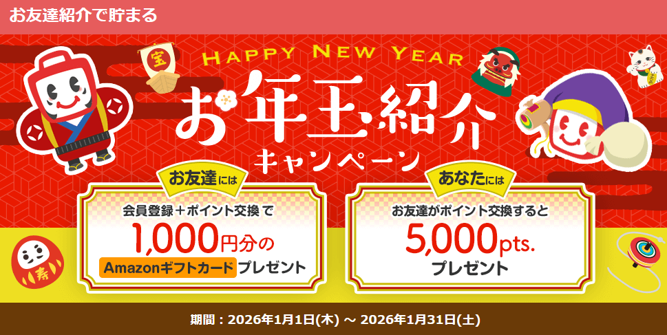 また、最近、友達紹介が一新され、還元制度が非常に秀逸なものに生まれ変わりました。長く継続的にポイントを得られやすいオススメのサイトです。