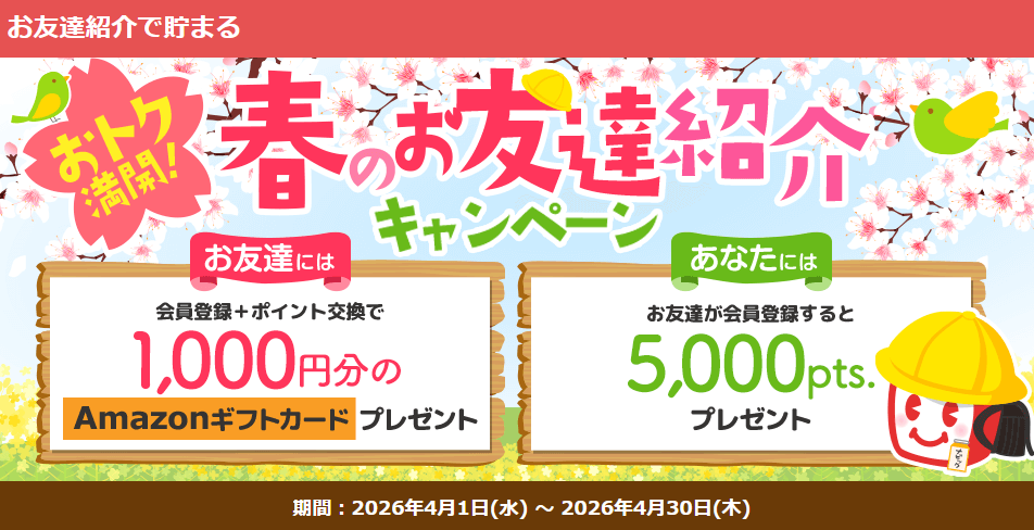 また、最近、友達紹介が一新され、還元制度が非常に秀逸なものに生まれ変わりました。長く継続的にポイントを得られやすいオススメのサイトです。