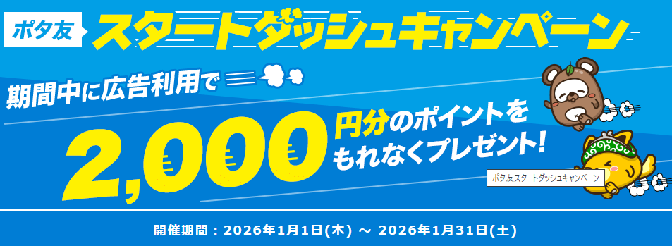 登録の3ヶ月後の月末までにポイント交換で100円 登録月末までに10000円以上の広告利用で最大2000円分のポイント付与 |