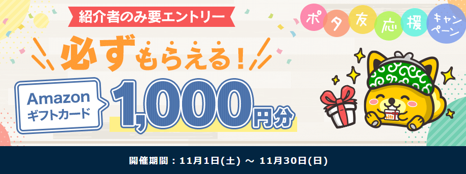 ①キャンペーン期間内(11月30日まで)に、紹介プログラムを通してハピタスに新規登録をおこない、お買い物やサービスの広告を利用して12月31日までに5000P以上を貯めると1500Pプレゼント。(2026年1月上旬付与)